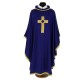 Casula confezionata con pregiato tessuto acetato/viscosa , collo ad anello, croce applicata sul mantello impreziosita da pietra applicata, sbieco perimetrale dorato. Il taglio classico a ruota garantisce una comoda vestibilità. Per i ricami eseguiti macchina con telai di alta precisione, sono utilizzati filati in seta dorata. Corredata di stola.