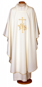 Casula economica in 100% poliestere, semplice ma raffinata. Presenta un collo quadro e un ricamo in stile classico applicato direttamente sul mantello, conferendo eleganza e tradizione al capo. Ideale per celebrazioni liturgiche sobrie ma curate.