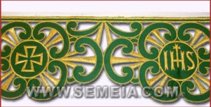 PIZZO RASO cm 15 TRAFORATO IHS/CROCE/VOLUTE VERDE.