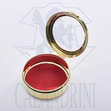 Teca portareliquie semplice di forma tonda diametro 5 cm circa, realizzata in ottone dorato con interno rosso. Articolo prodotto in Italia.